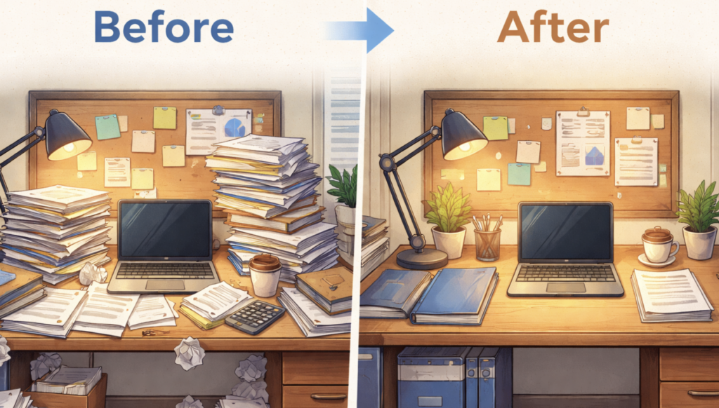 TurboQuantは作業机に置くメモの「書き方」を根本から変える技術だ。従来のメモは数値を正確に記録しようとするあまり1件あたり16ビットを消費していたが、TurboQuantは2段階の工夫でこれを3〜4ビットまで圧縮する。